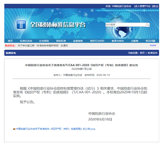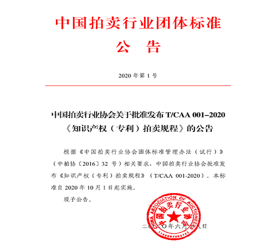 協會通知 | 中國拍賣行業協會關於批準發布T/CAA 001-2020《知識産權(專利)拍賣規程》的公告