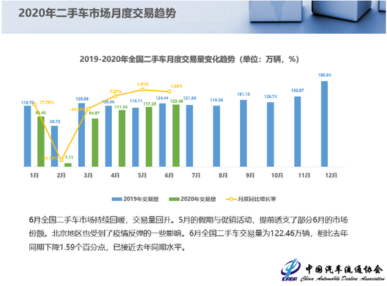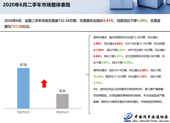 2020年6月,全國二手車市場(chǎng)交易量122.46萬輛,交易量環比增長(zhǎng)4.41%,月度同比下降1.59%。交易金額爲737.48億元。