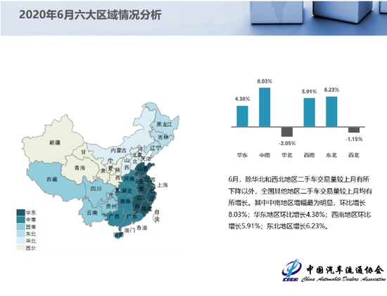 6月,除華北和西北地區二手車(chē)交易量較上月有所下降以外,全國其他地區二手車(chē)交易量較上月均有所增長(zhǎng)。其中中南地區增幅最爲明顯,環比增長(zhǎng)8.03%;華東地區環比增長(zhǎng)4.38%;西南地區環比增長(zhǎng)5.91%;東北地區增長(zhǎng)6.23%。