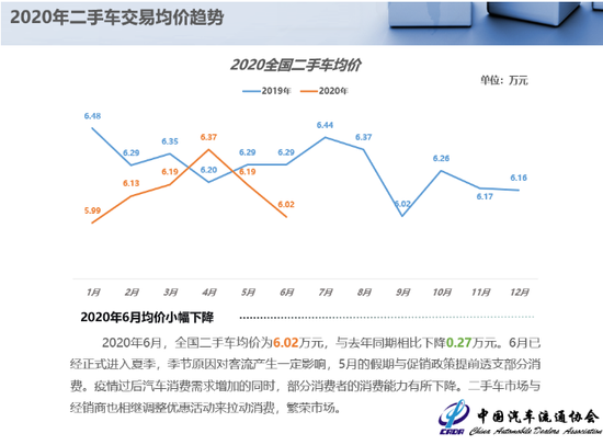 2020年6月,全國二手車(chē)均價爲6.02萬元,與去年同期相比下降0.27萬元。6月已經正式進入夏季,季節原因對客流産(chǎn)生一定影響,5月的假期與促銷政策提前透支部分消費。