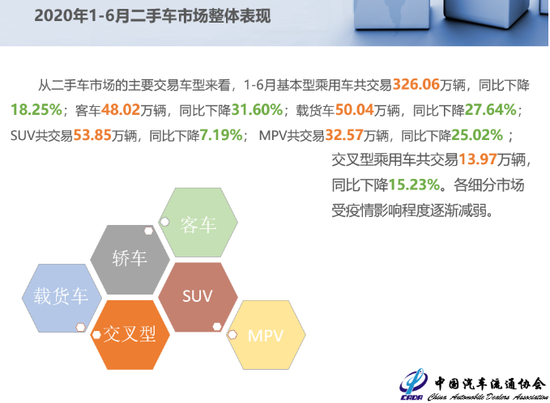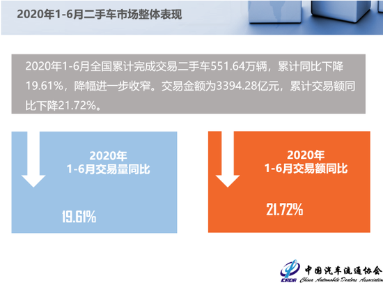 2020年1-6月全國累計完成交易二手車(chē)551.64萬輛,累計同比下降19.61%,降幅進一步收窄。交易金額(é)爲3394.28億元,累計交易額(é)同比下降21.72%。