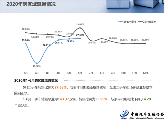 6月二手車(chē)轉籍比例爲27.68%,與去年同期差距繼續收窄,全國二手車(chē)市場(chǎng)轉籍業務基本回到正軌。1-6月二手車(chē)轉籍總量爲143.37萬輛,轉籍比例爲25.99%,與去年同期相比下降瞭(le)4.29個百分點。