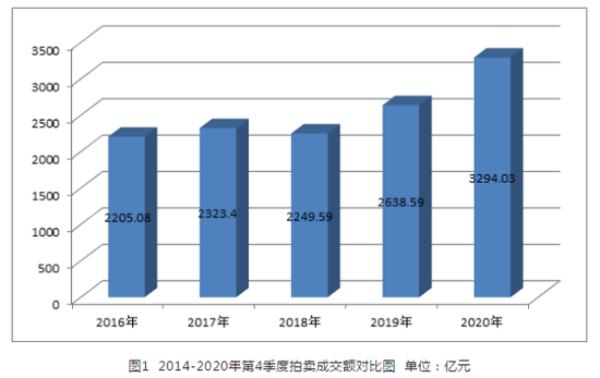 據商務部“全國拍賣業務統一平台”數據統計,第4季度得益於(yú)疫情有效控制和企業全面複工複拍,成交額出現大幅補(bǔ)漲,拍賣行業總成交額達到3294.03億元,較去年同期(2638.95億元)增長 24.82%(見圖1)。