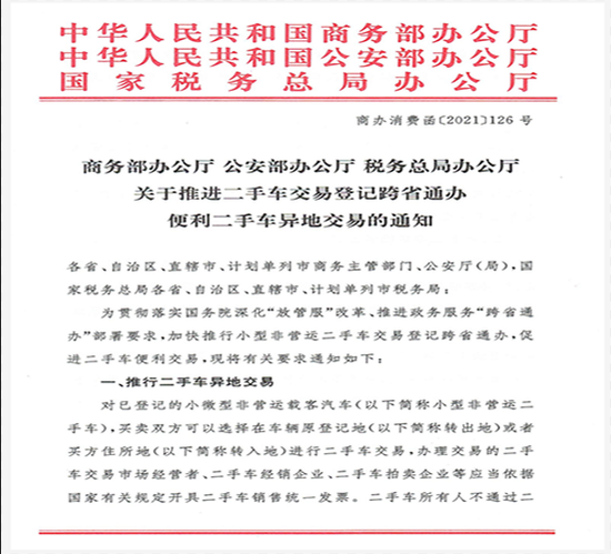 爲貫徹落實國務院深化“放管服”改革、推進政務服務“跨省通辦”部署要求,加快推行小型非營運二手車交易登記跨省通辦,促進二手車便利交易,加快形成二手車交易全國統一大市場,近日,商務部、公安部、稅務總局聯合印發《關於(yú)推進二手車交易登記跨省通辦 便利二手車異地交易的通知》(以下簡稱《通知》),從制度方面著(zhe)力解決二手車異地交易周期長、不便捷等問題,進一步促進二手車交易行業發展。