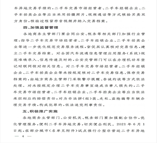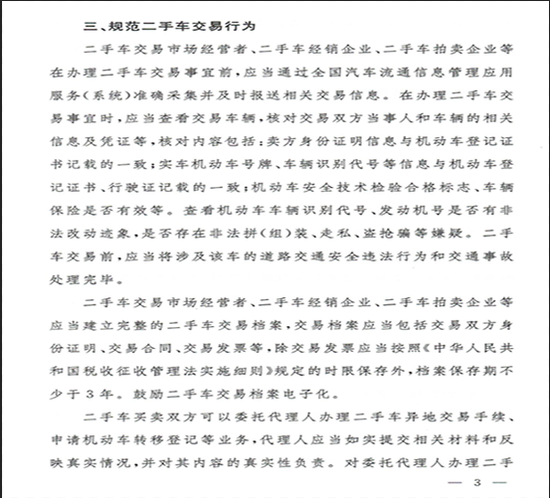 三是規範二手車交易行爲。《通知》進一步強化瞭(le)經營主體責任,確保交易安全,維護交易各方合法權益。要求二手車經營主體在辦理二手車交易事宜前,應當通過全國汽車流通信息管理應用服務(系統)準確採集並(bìng)及時報送相關交易信息,核對二手車交易雙方當事人和交易車輛的相關信息及憑證,建立完整的二手車交易檔案,並(bìng)按照規定的時限保存。對二手車買賣雙方委托代理人辦理二手車異地交易手續提出瞭(le)細化要求。