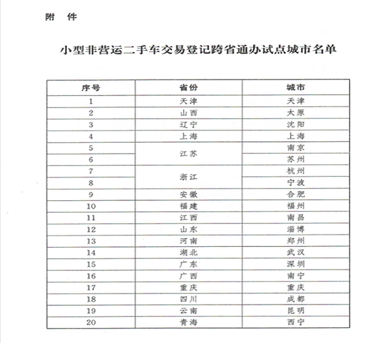 此外,《通知》對政策落地實施進度做瞭(le)具體部署,明確(què)2021年6月1日起,在天津、太原、沈陽、上海等20個城市(名單見附件)試點推行小型非營運二手車異地交易登記;自2021年9月1日起,直轄市、省會市、自治區首府市、計劃單列市全部推行;2022年全國全面推行。