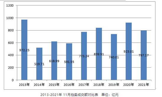 據“商務部業務系統統一平台”統計,11月份,全國拍賣企業拍賣成交場(chǎng)次11112場(chǎng),較去年同期增加1949場(chǎng),實現成交額(é)797.17億元,同比下降13.63%(見圖)。11月份,全行業傭金收入5.06億元,同比微增0.45%;主營業務利潤2.23億元,同比下降14.66%。