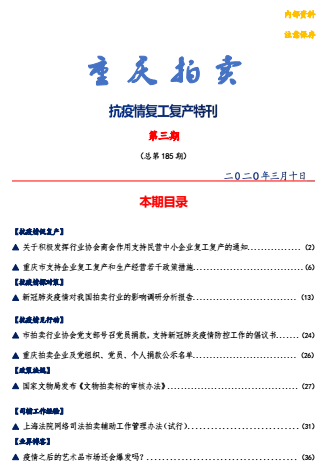 重慶市拍賣行業協會專門制作《抗疫情複工複産(chǎn)特刊》,收集彙總複工複産(chǎn)相關政策資訊,在重慶當地拍賣企業間進行分享,方便拍賣企業瞭(le)解最新政策,引導拍賣企業複工複産(chǎn)。