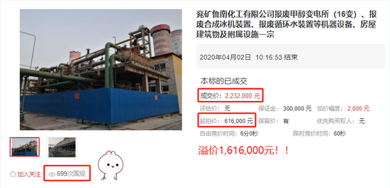 4月2日一個明媚的早上,拍賣師一聲令下拍賣會正式開始。報(bào)廢化工設備(bèi)及建築物拆除權拍賣以616,000元起拍,加價幅度爲2000元。屆時有超過10位的競買人此起彼伏,争搶不斷。随著時間的推移,标的競價也逐步進入白熱化。在最後的多輪争搶中,有2位競買人陸續出價競價激烈,出價的時間間隔都可以用秒來計算,讓人看瞭也是激動萬分!最終競買人N3754以2,232,000元的出價結束瞭這場沒有硝煙的“金錢較量”。在此也恭喜這位買家,成功入手标的!